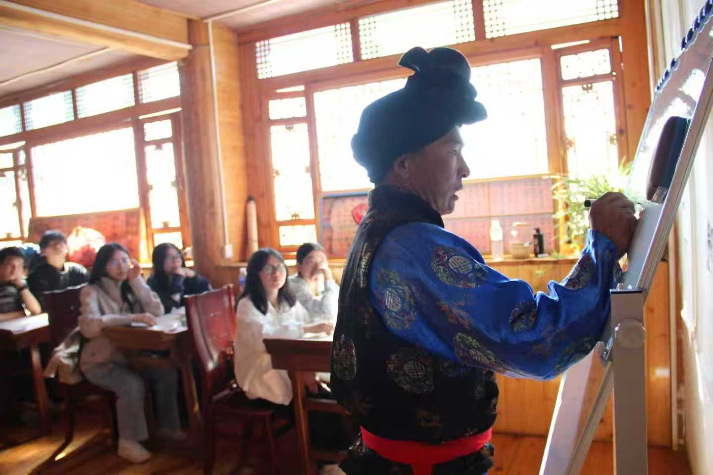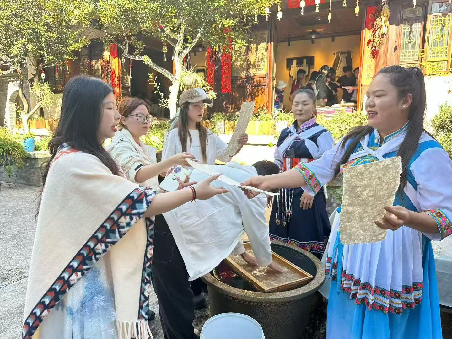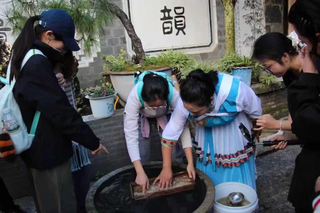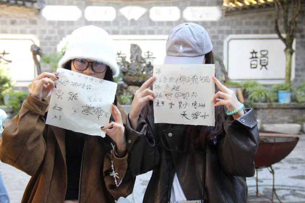 车行过蜿蜒的山路,拉市海的波光在云隙间忽隐忽现。当团队踏进恩宗村艺术馆的那一刻,时间仿佛缓缓慢了下来。在这里,学习不再是课堂里的讲述,而是指尖与自然材料的真实触碰。同学们亲手捞起纸浆,制成带有叶脉的手工纸,每一张都承载着纳西人对自然的理解与尊重。提笔蘸墨,学写东巴文字,那些如鸟如兽的笔画,不只是符号,更是一个民族看待世界的眼睛——山、水、爱、家,皆在弯折起伏间活了过来。