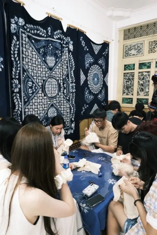 师生团队走进周城璞真扎染坊与双廊古镇,围绕白族扎染技艺展开深度体验与创作实践。同学们亲手完成从捆扎到染色的全过程,在布帛间感受蓝白交融的天然肌理与视觉韵律。教师引导大家在尊重传统的基础上,探索如何将扎染的图案语言与色彩系统转化为现代设计元素,启发学生在纺织品设计、品牌视觉等方向展开创新思考。