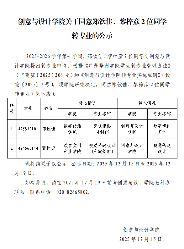 创意与设计学院关于同意郑钦佳、黎梓彦2位同学转专业的公示
